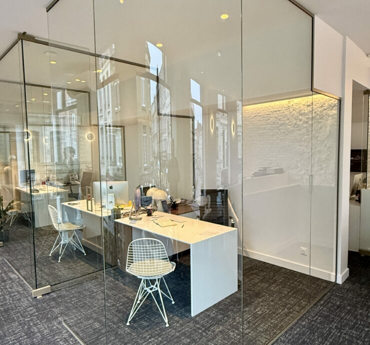 Cloisons de bureau en verre composée d’une glace claire 12 mm joint bombée et de parties fixes en feuilleté