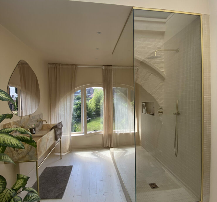 Parois de douche en verre anticalcaire 8 mm trempé et profil alu aspect laiton satiné. Miroir 6 mm sur
