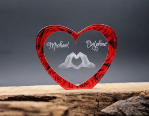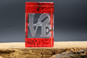 Vous cherchez un cadeau Saint Valentin ? Pour un homme, pour une femme, votre mari, votre copain ou votre copine, offrez un trophée en verre avec gravure laser à l’intérieur du verre et impression couleur de pétales de roses.