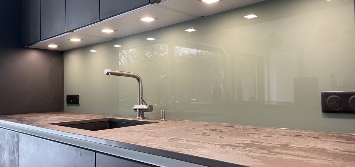 Crédence de cuisine en verre Extra clair 6 mm, laquée en face arrière de la couleur de votre choix. Pose collée. Possibilité de prévoir des trous pour les prises.Read more