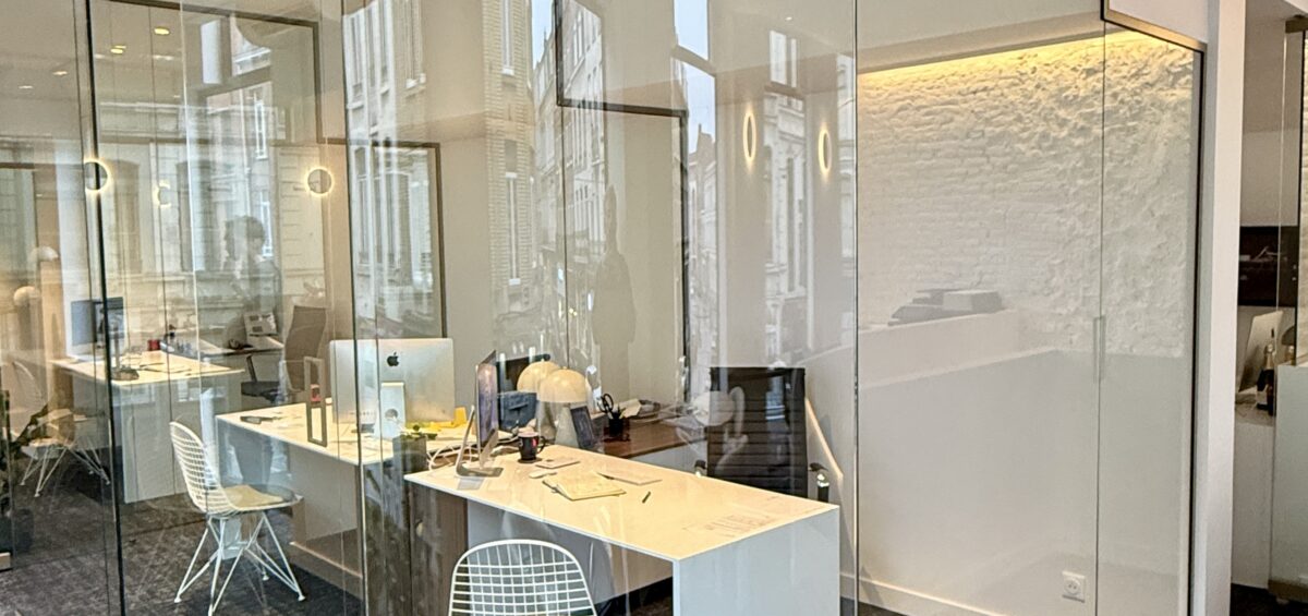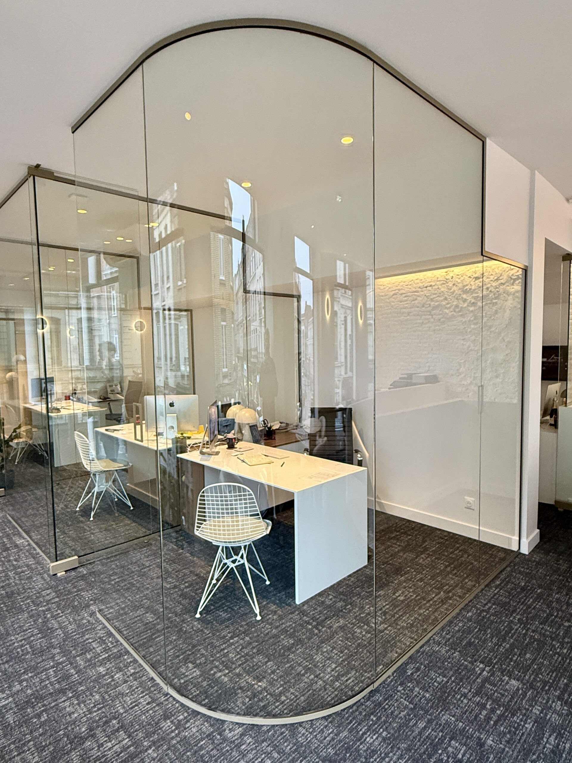 Cloisons de bureau en verre composée d’une glace claire 12 mm joint bombée et de parties fixes en feuilleté clair 66/2 contour profilé alu thermolaqué RAL 1035 Beige nacré; et d’une porte claire trempé 12 mm avec un kit penture à fermeture automatique.
