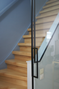 Cloison d’escalier en verre feuilleté 44/2 avec pourtour en alu thermolaqué noir.