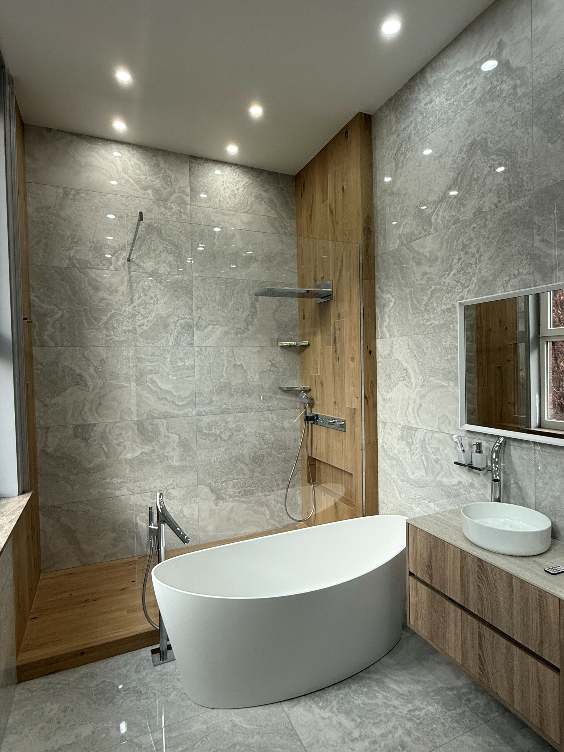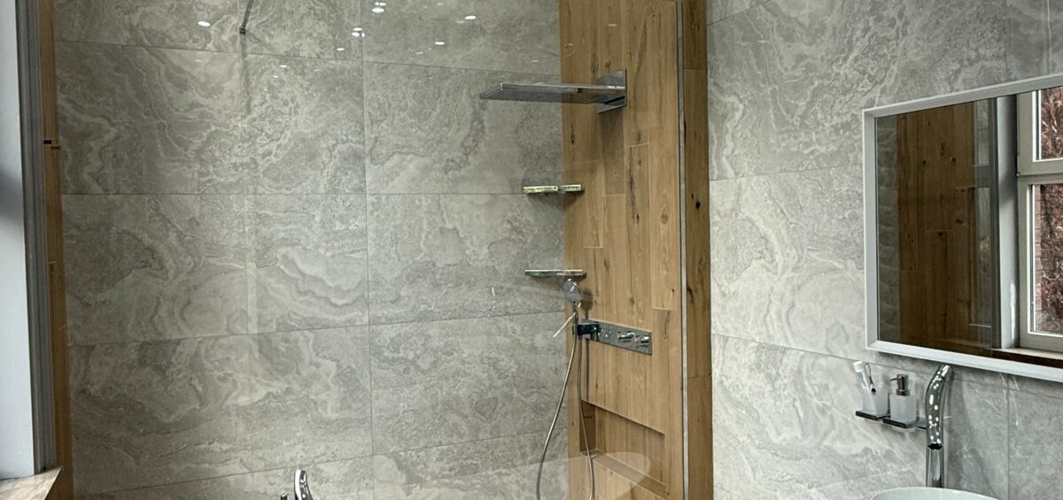 Paroi de douche en verre Extra clair 8 mm trempé fixé au silicone au niveau du receveur et par une barre raidisseur sur haut.