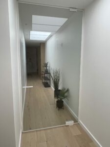 Porte en verre trempé 12 mm sur pivot avec axe décalé et contour profils « U » thermolaqué blanc RAL 9005.