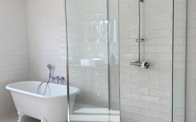 Comme pour les crédences de cuisine, le verre offre l’avantage de limiter le nombres de joints dans la pièce d’eau.