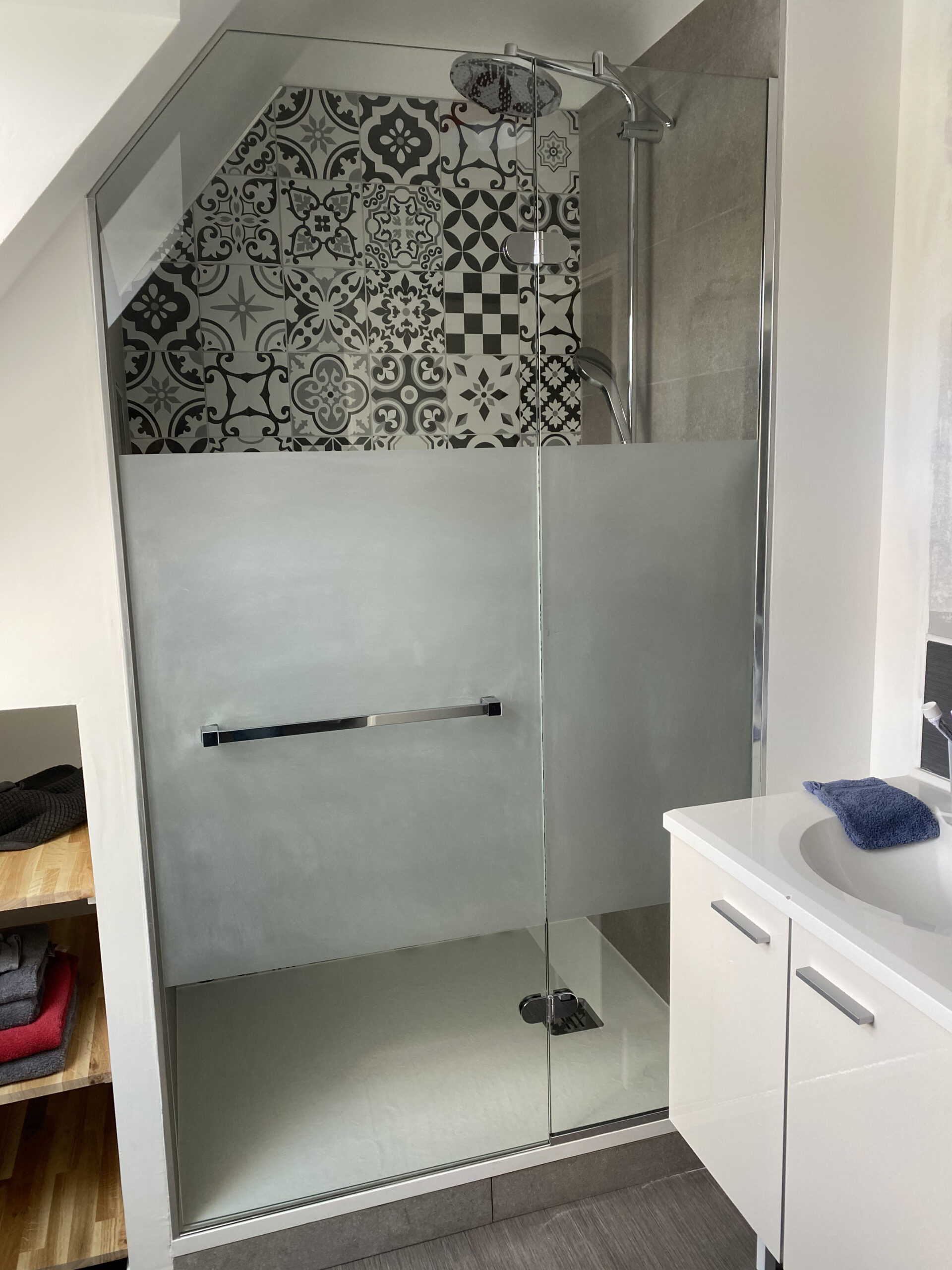 Les pares douches et miroirs peuvent être traités « cache-cache », un procédé de notre invention permettant de laisser apparaître un motif au contact de la buée ou l’eau ! A voir pour être conquis !Toutes nos parois de douche ou porte sont réalisées sur mesure.Le délai est de 1 à 2 semaines. Nous exécutons la pose directement chez vous.