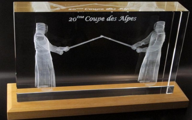 Pour la 20éme coupe des Alpes, nous avons réalisé ce trophée sur mesure : un bloc de verre de 350x250x60 avec une gravure 3D, posé sur un socle en bois.