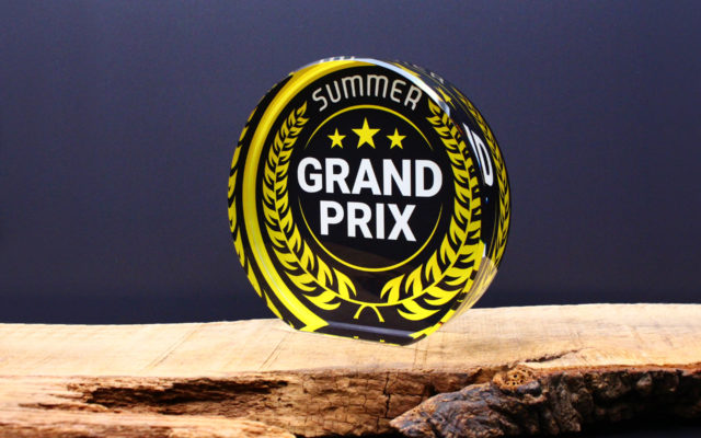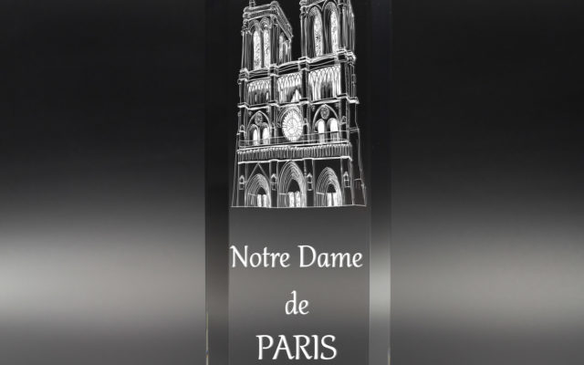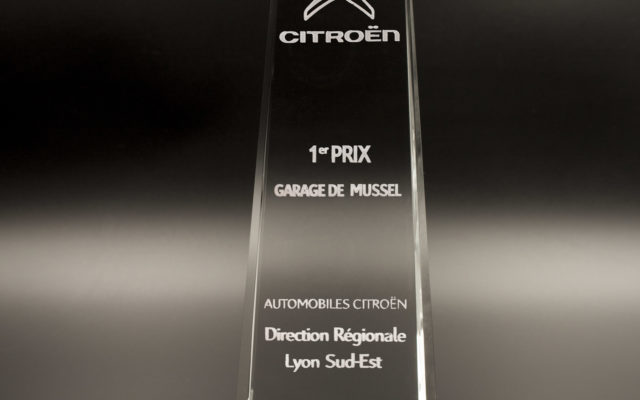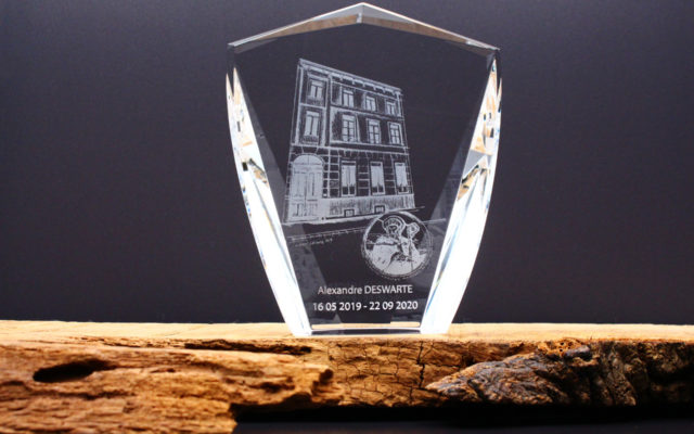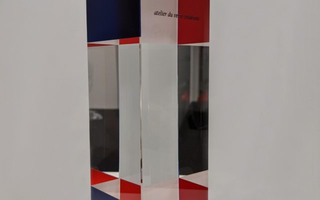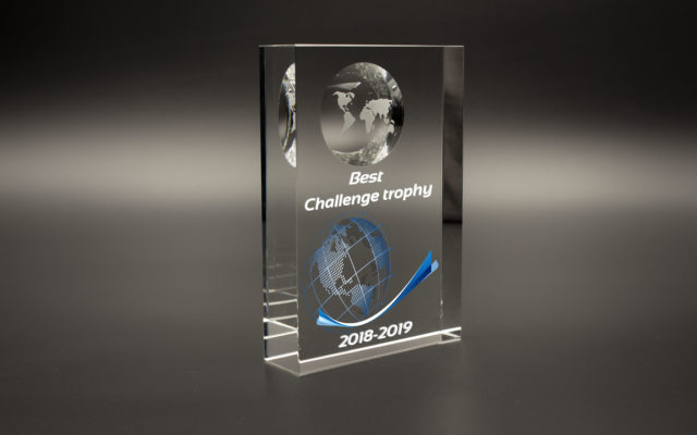 Trophée en verre optique avec mappemonde dépoli face arrière en vitrophanie.
