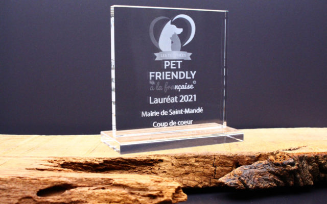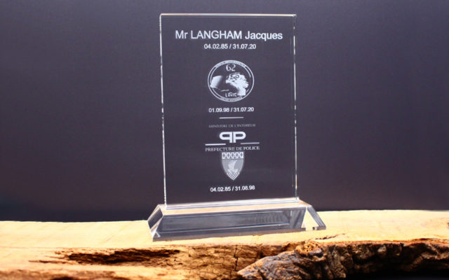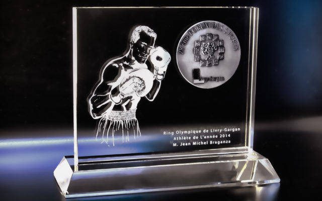 Trophée vertical biseauté TR2065 en verre optique. De 152x76x170 mm ou 203x76x218 mm, collé sur socle en verre, avec gravure laser 2D et son coffret.